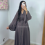 Elle est vendue avec son foulard assorti. La abaya est également accompagnée d’une ceinture amovible, ce qui vous permet de la porter de deux façons : soit cintrée pour une allure plus structurée, soit ample pour un effet plus fluide.